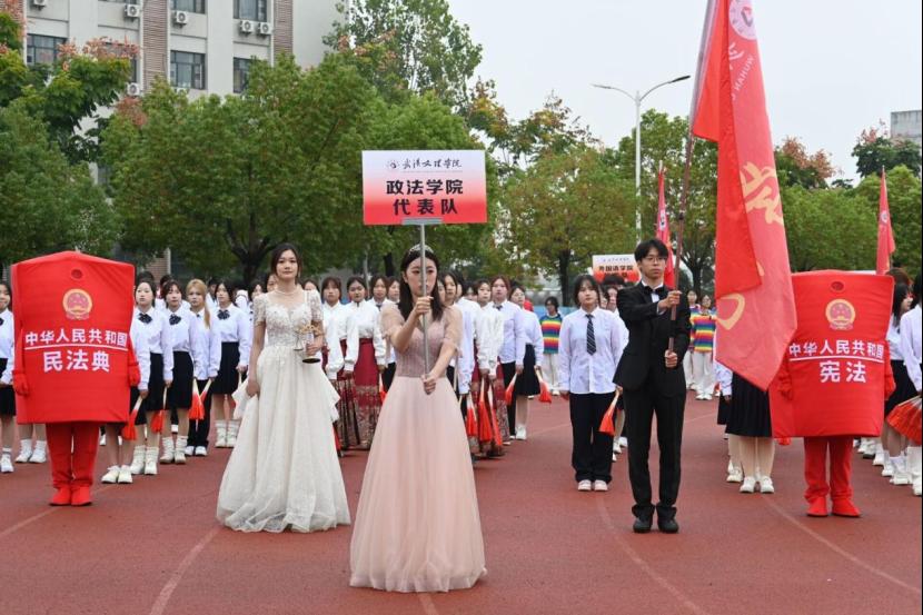 运动会开幕式,升国旗、奏国歌时嘹亮的声音响彻整个田径场,啦啦队、图案舞、跆拳道展示、舞龙舞狮表演、团体舞、彩球队以及各学院方阵,他们迈着整齐的步伐,昂首阔步,在主席台前一展雄姿。且看永乐高131net方阵,学子们的步伐铿锵有力,雄赳赳气昂昂,礼仪队员手持天秤,展现了政法学子对公平正义的追求。
