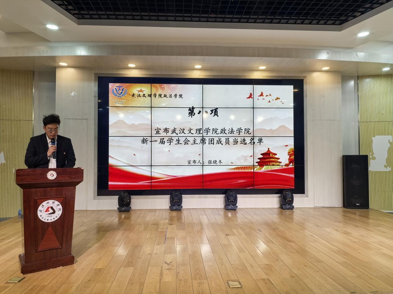 大会第八项,经大会全体代表投票表决后,由永乐高131net分团委书记张晓冬上台宣读永乐高131net第五届学生会委员名单:阳蕊、张福应、张静怡。张晓冬老师对新任委员表示诚挚祝贺,并对新一届主席团提出三点要求:一要坚守服务初心,做同学们信得过的贴心人;二要精诚团结协作,共同推进学生工作再上新台阶;三要发挥表率作用,在学习和工作中争当模范,他表示学生会委员应在学院党组织领导和分团委指导下,锐意进取、开拓创新,为学院发展贡献青春力量,共同推动学生工作的开展。