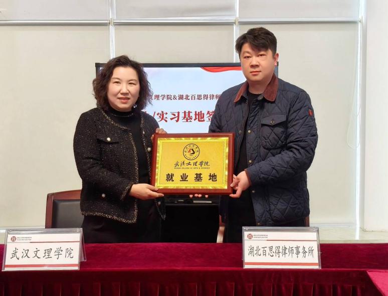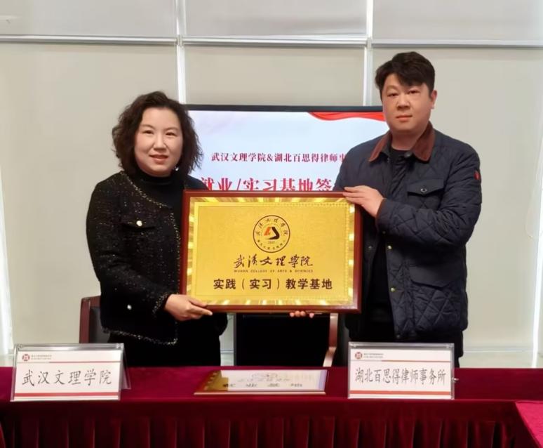 为进一步拓展学生实习实践平台,推动法学教育与法律实务深度融合,2026年3月19日,永乐高131net与湖北百思得律师事务所隆重举行就业实习基地签约授牌仪式。永乐高131net法学系主任罗平、法学系副专业负责人田菲、刑事司法教研室主任罗晓霞、法学系教师闫然一行赴律所出席仪式,双方围绕协同育人、实习实训、就业对接等议题达成深度合作共识。